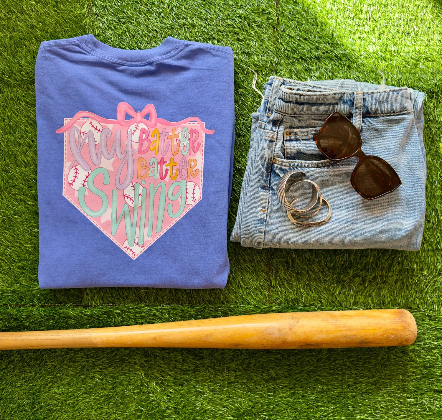 Double the fun, double the baseball love! This vibrant blue long sleeve tee is a total standout for any baseball enthusiast. The front features a cute circular "Play Ball" logo tucked into the chest pocket area, complete with a sweet pink bow and playful multicolored lettering. Then flip it around for the full show — a large home plate-shaped graphic on the back spells out "Hey Batter Batter Swing" in dreamy pastels with baseball accents and a matching pink bow on top.