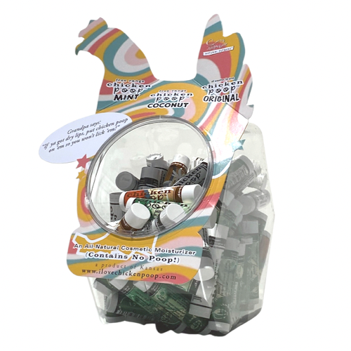 Chicken Poop is made with bees wax, jojoba oil, vitamin E and avocado oil. It is Gluten Free! And, get this…contains NO POOP! But why, you ask? Why is it called Chicken Poop? Jamie’s grandpa would joke anytime you complained of having chapped lips…”lets put some Chicken Poop on your lips so you wont lick ‘em”